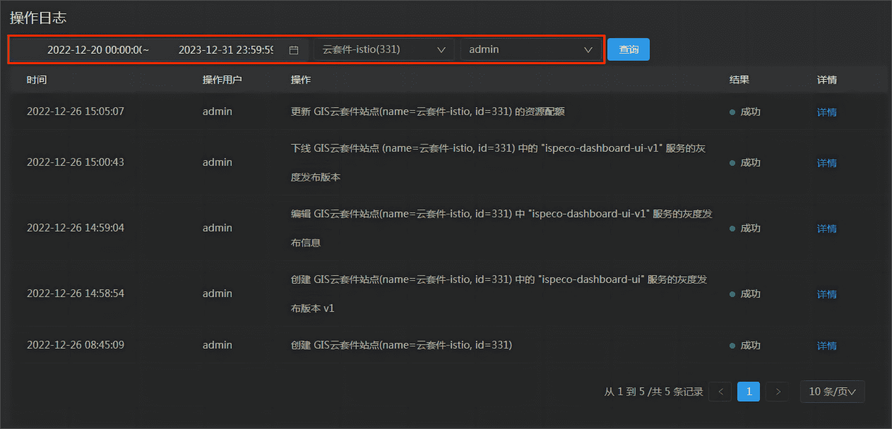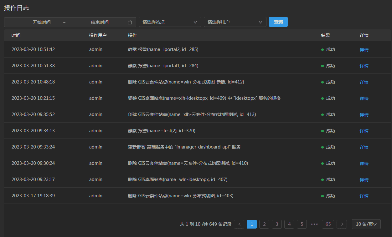 在操作日志页面,可自定义起止时间,选择基础服务或某一站点,指定管理员账号或普通用户账号,来查看任一时间段内,在所选站点该操作用户执行的所有操作记录。在页面内,用户可查看符合筛选条件的操作具体时间、操作用户、具体操作记录、操作执行结果和操作详情。