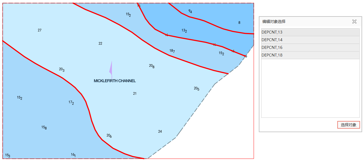 - 在地图选项卡下,点击选择进入选择模式。在海图窗口中选择对象,使用 Shift 键或者使用拖框方式可同时选中多个对象。