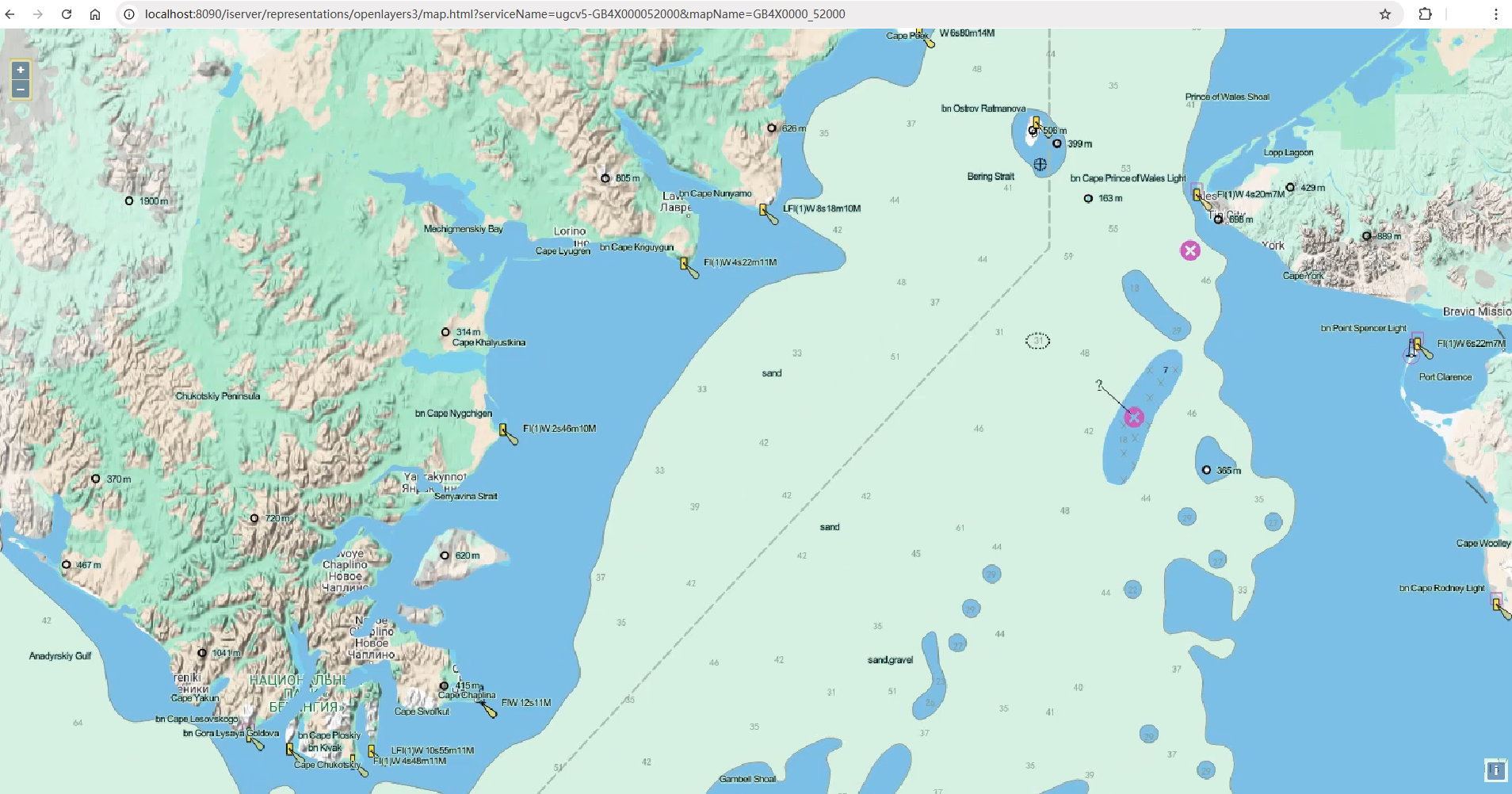 - ChartBrowsing 节点 -> US1BS01M_3500000 节点右键菜单添加到新地图,自动打开的地图窗口中可以看到符合 S-52 显示标准的海图数据。