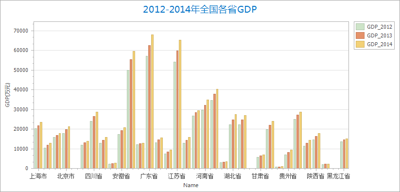 柱状图表特点:能够直观看出各个数据的大小,易于比较数据之间的差别。例如:统计全国不同省份的GDP,如下图所示