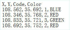 如下图所示,要导入的 *.csv文件内容如下图,CSV数据以英文逗号(“,”)作为分隔符,首行为数据的字段信息。共包含了四列属性数据,每一列的含义分别是:X 坐标值,Y 坐标值,类型编码和颜色。