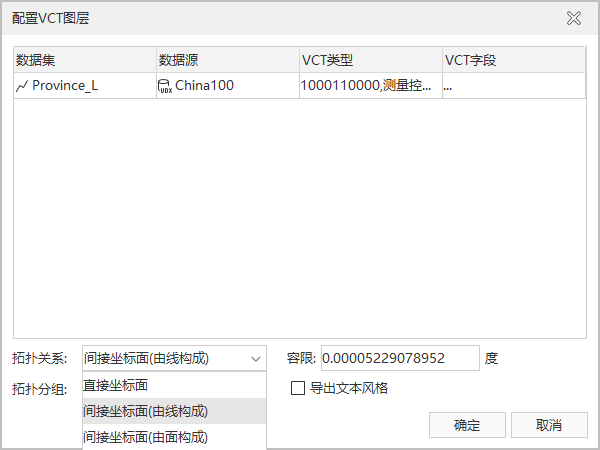 - 拓扑关系:配置与导出面数据集存在拓扑关系的线数据集。如果在此指定了某一面数据集与线数据集之间的拓扑关系,则须将该线数据集和面数据集同时导出至改VCT文件。例如设置面数据集行政区与线数据集行政区界线建立拓扑关系,则导出VCT文件中必须包含数据集行政区及行政区界线。