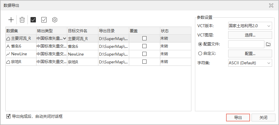 - 依次对转出数据的VCT类型、VCT字段进行设置,设置完成后,单击确定按钮,退出当前数据集设置窗口,在数据导出对话框中单击导出按钮,执行导出VCT文件的操作。
