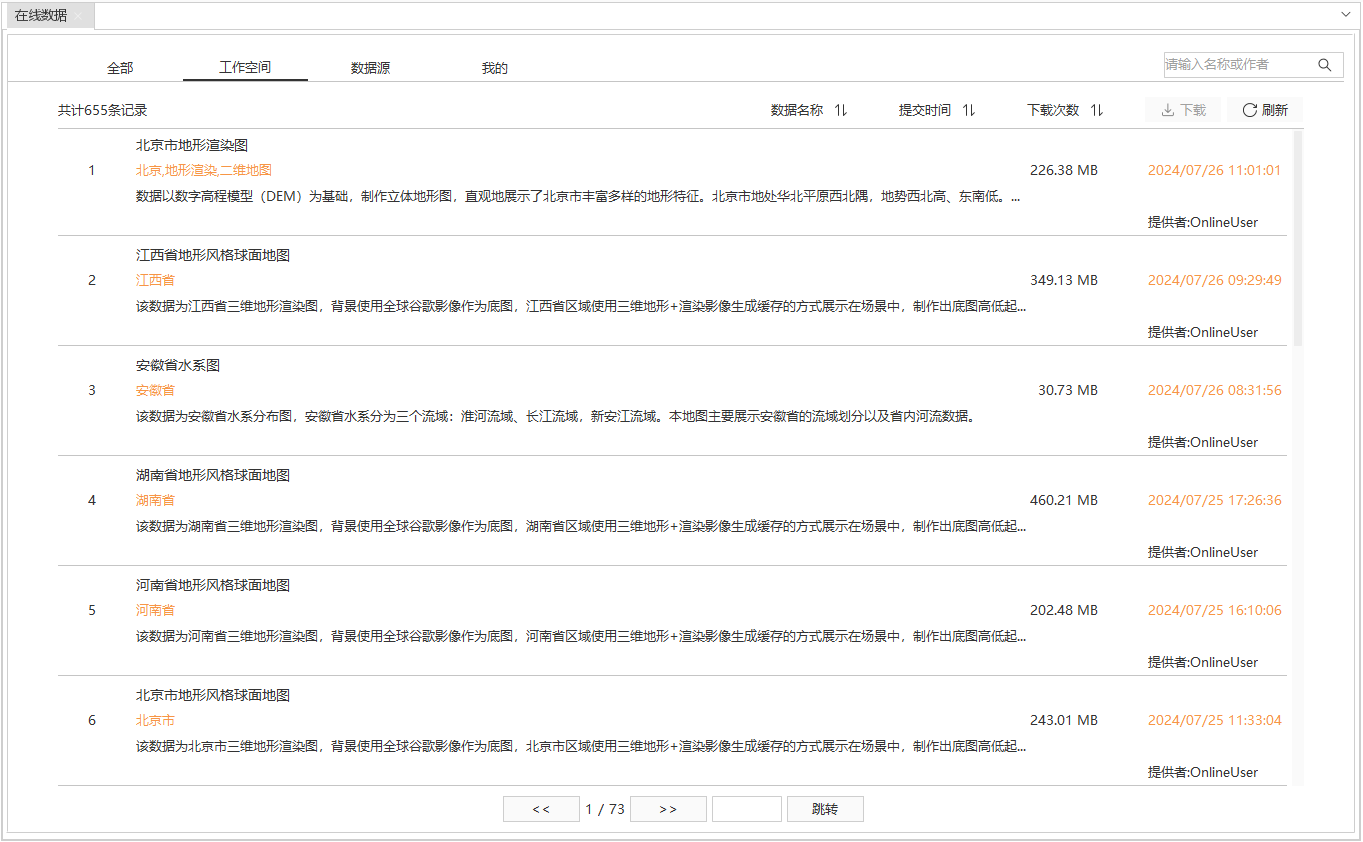 SuperMap提供的在线数据服务能够将本地工作空间上传至SuperMap Online或iPortal供其他用户下载使用。