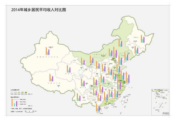 可选的统计专题图模板有:人口密度对比柱状图、城乡建设用地规模对比三维饼状图、年龄结构人口数对比三维玫瑰图、第一产业生产额增加额三维柱状图;用户也可以通过统计专题图的风格设置窗口设置该专题图的各个参数,自定义制作统计专题图。下图所示为统计专题图的示意图,用柱状图的形式表达各省的城镇人均收入、农村人均收入与当地收入水平,与传统的柱状图不同的是柱状图为圆形柱状图,并且使用轻微的颜色渐变制造了立体效果,具体制作方法请参考示例地图->人口与经济专题图。