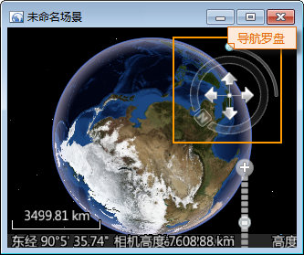 下图为执行全球操作的效果图,注意场景窗口中的导航罗盘的变化。(导航罗盘用来控制场景中地球所呈现的视角状态,以及放大缩小场景等操作。)