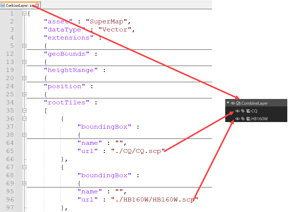 - 通过嵌套SCP加载的三维瓦片将以图层组的形式在图层管理器的普通图层结点下显示。