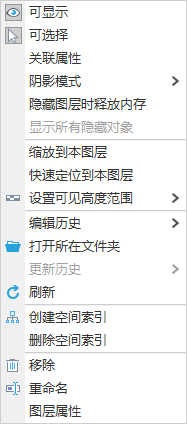 图层的右键菜单提供了多种图层操作工具,例如:关联属性、创建空间索引、历史记录管理等。