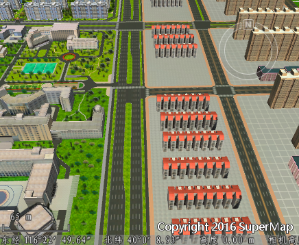 例如,在地上场景浏览时,也需要看到浏览区域内地下管线的铺设情况,就可以对道路图层设置卷帘,同时开启地下,设置地下透明度,就能在浏览时达到想要的效果。如下图中所示,就是对道路图层设置了卷帘区域,并开启地下、设置透明度为100%(全透明),而得到的场景显示效果。