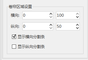 横向、纵向分隔条的值域,是以当前显示的场景窗口为参照而给出的左上角为[0,0]、右下角为[100,100]的虚拟区域,以百分比的方式计算。例如,上图中所示的横向分隔条值域为[27,100],代表场景窗口的27%以下是设置了卷帘的区域,27%以上的区域是没有设置卷帘的区域。也可以通过横向、纵向分隔条中的颜色区分卷帘的设置范围,蓝色部分代表设置了卷帘的区域,橙色部分代表没有设置卷帘的区域。