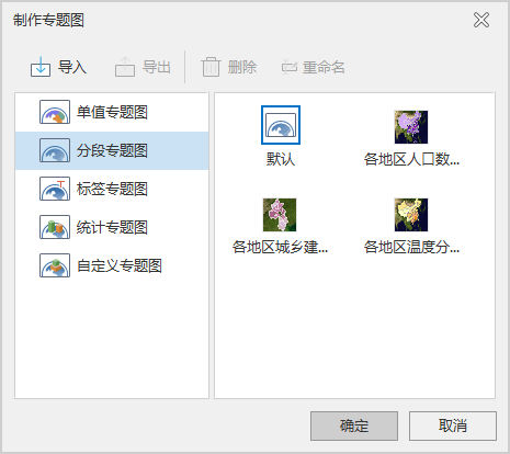 - 系统自带的专题图模板和用户自定义的专题图模板都会出现在“制作专题图”功能界面右侧区域中,可以通过模板管理器统一进行管理,请参见:“模板管理”。