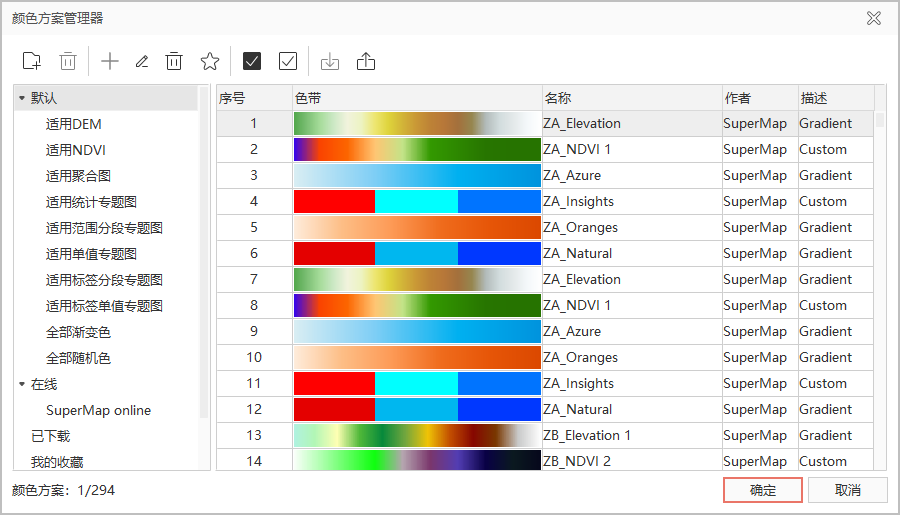 - 颜色方案管理器根据数据的适用情况,将默认组中的颜色方案分为适用DEM、适用NDVI、适用聚合图、适用统计专题图、适用范围分段专题图、适用单值专题图、适用标签分段专题图、适用标签单值专题图、全部渐变色、全部随机色共十个分组,便于用户根据使用情况选择颜色方案。