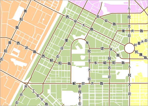 在地理世界中,道路往往被抽象成线对象(少数情况下道路也被抽象成面对象)。较窄的道路可以用单线来表示,较宽的道路可以考虑用双线表示。在利用道路名称给道路进行标注的时候,需要注意两个问题:标注时,标签要沿着道路走向,并且在道路上;对于较短的道路,也需要显示其名称。