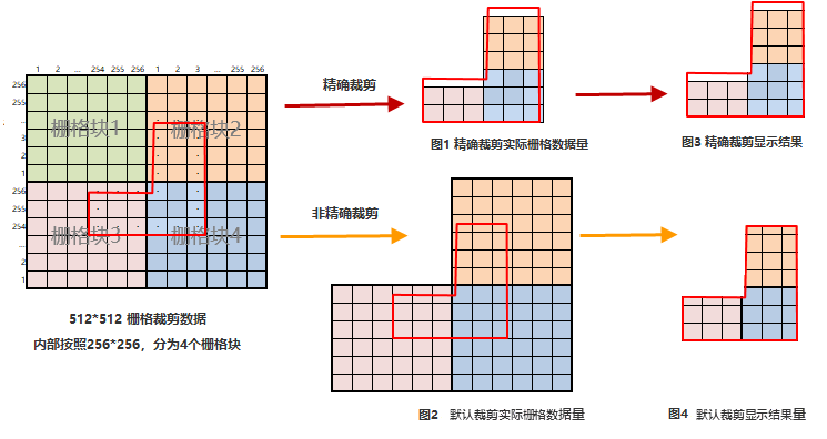 - 默认裁剪:裁剪区域边界处的数据处理单元是栅格块,若裁剪区域与栅格块相交,则保留整个栅格块。如下图2所示,若栅格块大小是256*256,裁剪区域与栅格块2、栅格块3、栅格块4相交,则三个栅格块全部保留,得到最终的实际存储数据,数据量较大