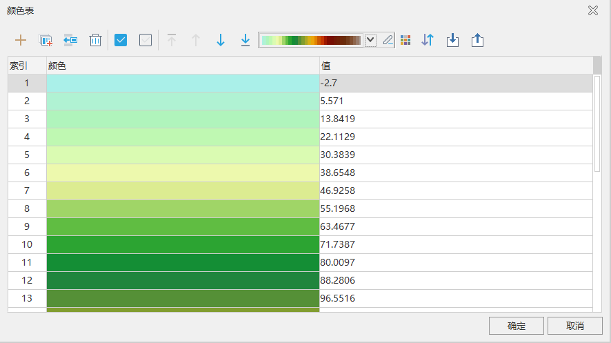 图:“颜色表”对话框 - 用户可通过该对话框设置栅格图层的颜色方案,或设置某个像元值所使用的颜色;也可通过添加新的像元值或者删除部分像元值来调整栅格数据的颜色显示方案。有关颜色表设置的详细说明,请参见颜色表设置对话框。