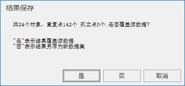 “结果保存”对话框显示模型检查的相关信息,包括重复点个数。单击“是”,移除重复点的结果覆盖源数据,单击“否”,移除重复点的结果另存为新的数据集。单击“取消”,取消结果保存操作。