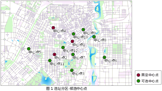 Currently, there are 3 primary schools in a region. It will establish 3 new primary schools in this region according to the demand. Selecting 9 locations as the optional locations, we will select 3 optimal locations for building the schools. As shown in the figure 1, the existed 3 schools are the fixed centers; 7 optional locations are the optional centers. The conditions to be met for building a new school: It takes the residents within the residential area no more than 30 minutes to walk to the school. The location-allocation analysis will give the optimal locations, and display the service area of each school including the existed 3 schools. As shown in figure 2, the No. 5, No. 6 and No. 8 optional centers are ultimately selected as the optimal locations to build the schools.