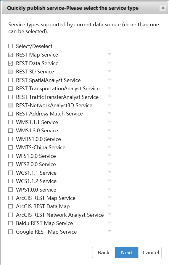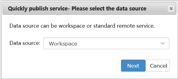In service management home page clicking the "Quickly publish services ", selecting data sources as working space, and then getting into the next step.