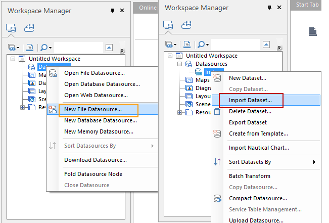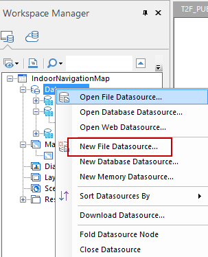 Step 1: create a datasource. In the workspace manager, right click "Datasources" node and then select "New File Datasource..." and navigate to an appropriate folder and enter a name. Click "Save" to complete the creation of a datasource.