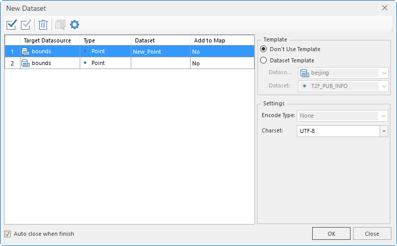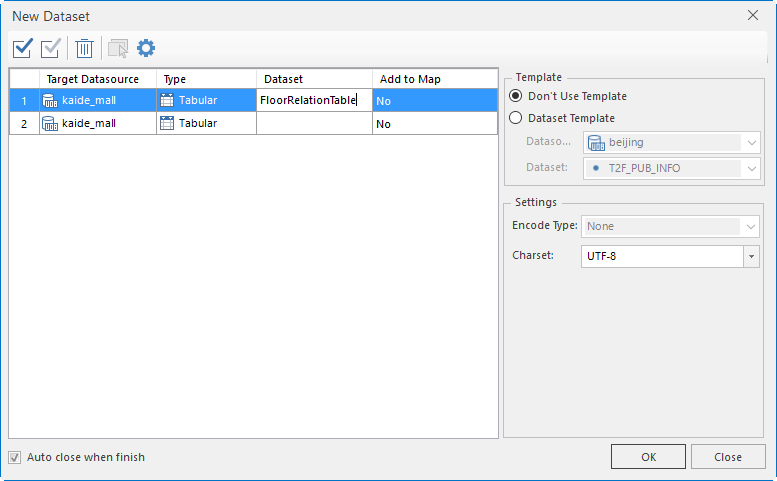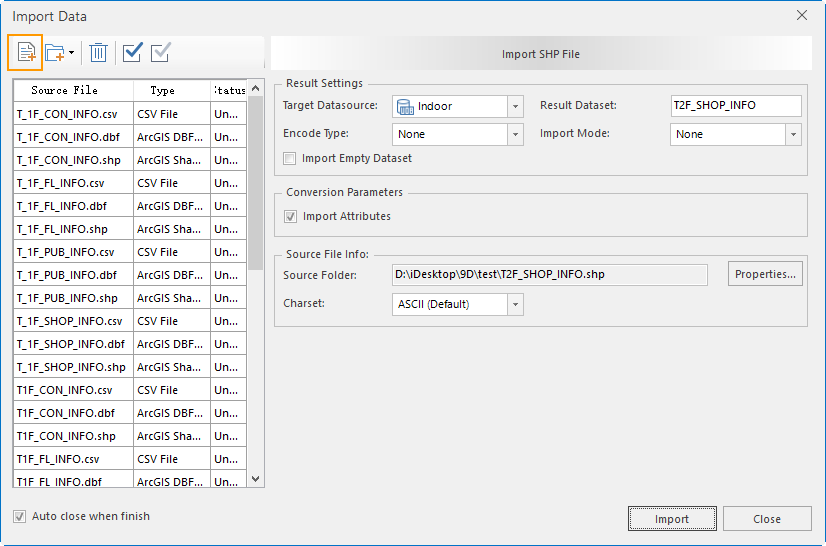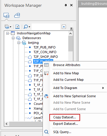 Step 2: Import datasets. Right click the datasource you created, and then select "Import Dataset...". In the pop-up dialog box, click to import files. Note: the point datasets involved in the navigation cross floors like stairs, elevators, and so on, need renaming as "Tfloor number_CON_INFO", for example "T7_CON_INFO".