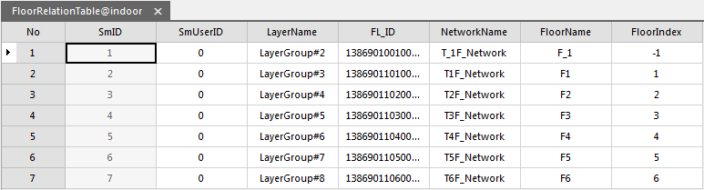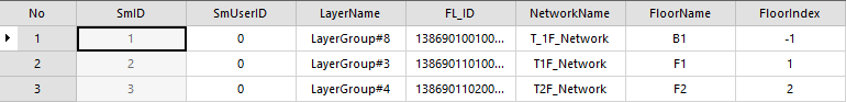 | FloorID | FL_ID (can not be changed) is used for floor display, road analysis, and navigation. Each floor has one ID, and all features in a floor have the same floor ID. | Wide character |