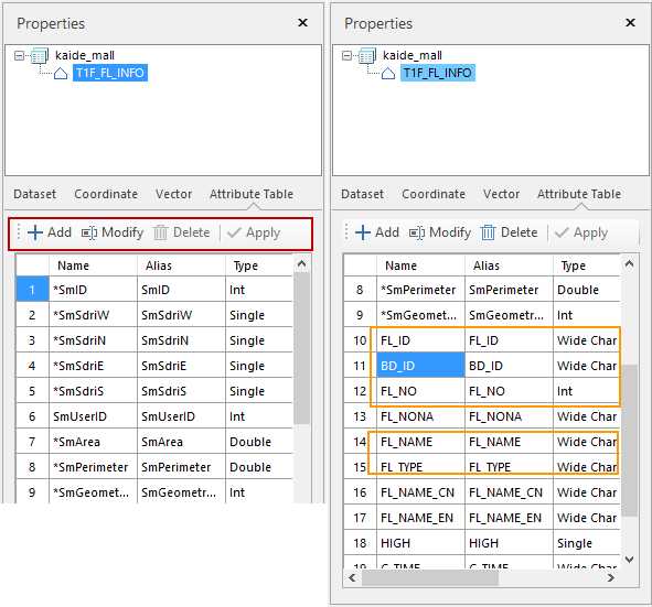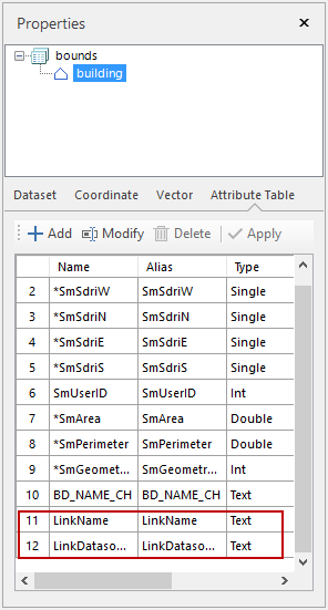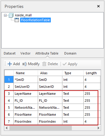 Right click FloorRelationTable dataset, and then select "Properties" to open the "Properties" dialog box, and click to add attribute items. Note: Item names must be unique, and you should click "Apply" button to save them.
