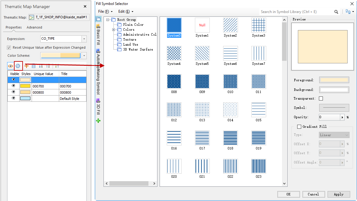 In the layer manager, right click your region layer and select "Create Thematic Map...". In the pop-up dialog box, select "Unique Values Map"> "Default". In the "Thematic Map Manager" dialog box, set the Expression as "CO_TYPE" and select an appropriate color scheme or you can click any item in the column Styles to set a color