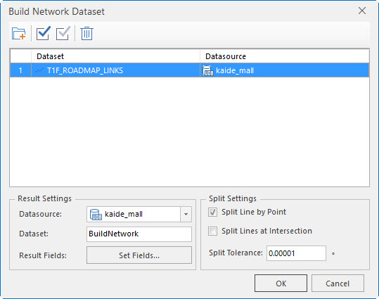 Click "Traffic Analysis" > "Network Analysis" > "Network by Topology" > "Structure 2D Network" to open the "Build Network Dataset" dialog box. Select the dataset you want to construct, check "Split line by line", enter the name of the output dataset, and click OK to finish the operation.
