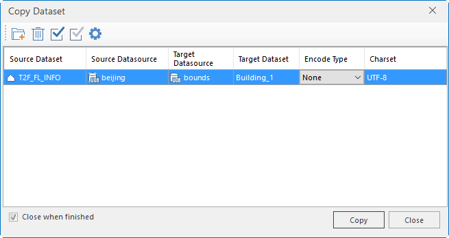 In the workspace manager, right click your dataset and select "Copy Dataset..." to open the "Copy Dataset" dialog box where you can set the target datasource as "bounds" and the target dataset name as "building".