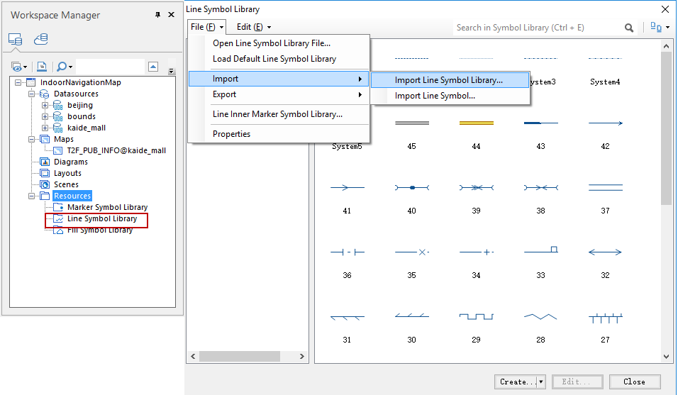 In the workspace manager, click Resource node and then double click Line Symbol Library to open the "Line Symbol Library" dialog box. In the dialog, click File > Import to import a line symbol or a line symbol library.
