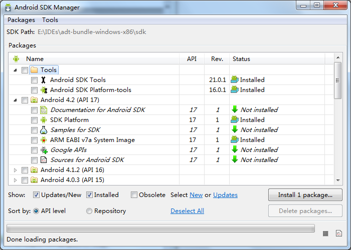 下载所需的sdk版本,运行 adt-bundle-windows-x86 下的 SDK Manager.exe ,即可运行 SDK 管理工具。