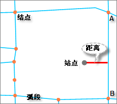 原则上,在交通网络分析中,可以指定网络中任意的点作为分析的经过点或障碍点,但应该在网络附近。如果这个点不在网络上(既不在弧段上也不在结点上),网络分析会根据该距离容限把该点归结到网络上,如图 6-1所示,桔色点代表网络结点,蓝色代表弧段,灰色点为站点,红色线段是站点到弧段 AB 的距离,如果该距离在设定的距离容限内,则把站点归结到弧段 AB 上。这个距离容限值通过setTolerance方法设置。