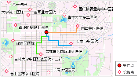 - 最近设施查找分析:查找从事件点出发,以最小耗费能够到达的若干个设施点,并给出从事件点到达这些设施点的最佳路径。