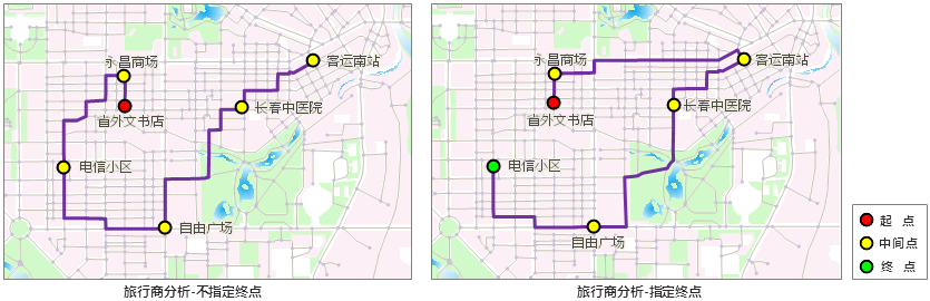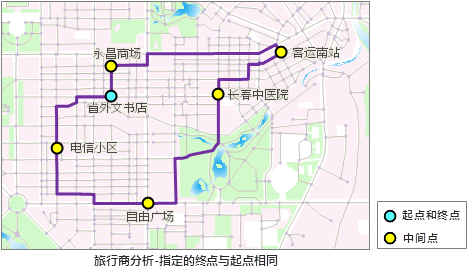 - 旅行商分析:在网络上查找经过一系列给定点的最优路径,这条路径具有最小耗费。