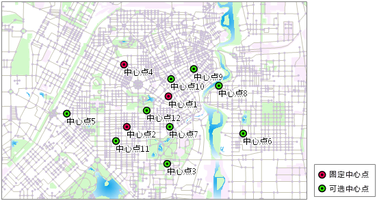 - 可选中心点是指可以建立服务设施的资源供给中心,即待建服务设施将从这些可选中心点中选址;