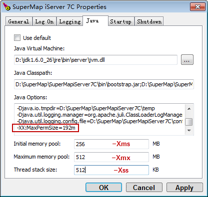 SuperMap iServer presets the recommended values of parameters of virtual machine, which doesn't need setting when the service.bat script is used for registering the service. But it must be set when the Tomcat7 command is used.