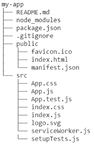 The sdirectory structure of the new created React project looks like the picture below. Creat React App is the best way to start building a new single-page application in React. It sets up your environment so that you can use the latest JavaScript features, and optimizes your app for procution. Under the hood, it uses Babel and webpack.