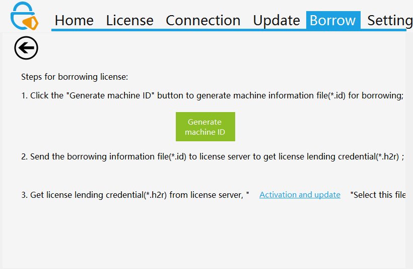 - License returning credential (*.r2h), used to return a lent license to the license server, which is generated by the computer who borrows the license.
