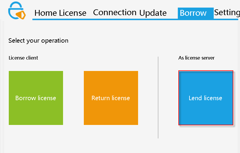 If there are licenses that can be lent, the Lend License button will appear. Click it, and enter the page for lending. If there are not any licenses that can be lent, the Lend License button won't appear. There are only Borrow License and Return License buttons. You can't lend license.