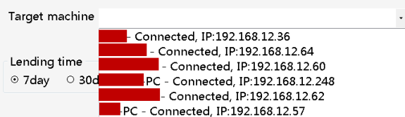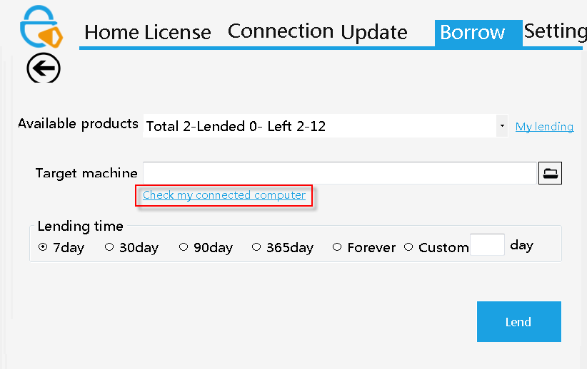 Click Lend License to enter the page for lending license. Find out target connected computers for borrowing, if the target computer exists in this list, then go to Step 3. If it doesn't exist, please go to the next step.