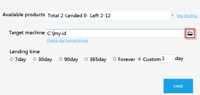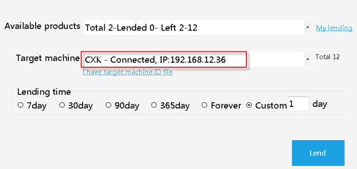 At last, click the Lend button, generate the lending credential file (*.h2r), and transfer this file to the target machine.