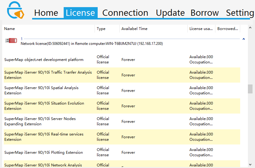 Go to the Borrow tab of SuperMap license center on the license server, you will see the figure as shown below.