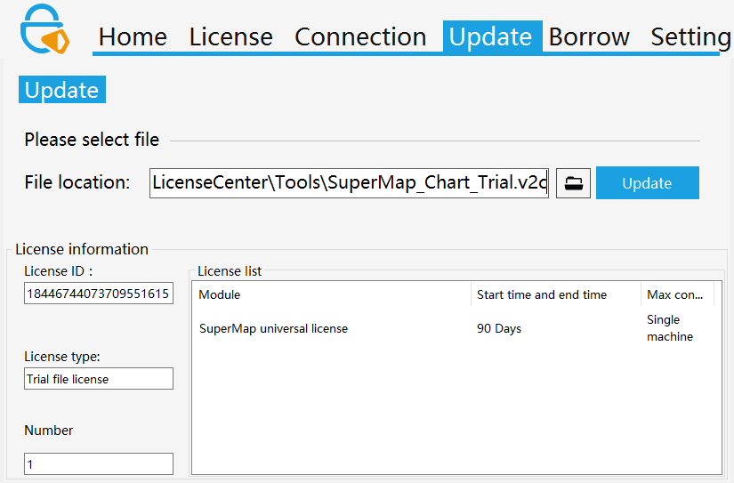 Open the "Update" page at SuperMap License Center, specify your trial license file at the "File Location", and then click "Update" to make it take effect. The 8C-version License Center can activate the 7C and 8C file licenses; the 9D-version License Center can only activate 9D file license.