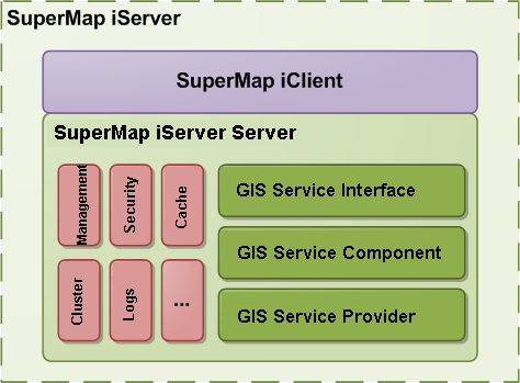 Besides GIS modules, as an enterprise GIS server, SuperMap iServer completely enjoys its server capabilities in the system structure, mainly including cluster, cache, management, log, and so on.