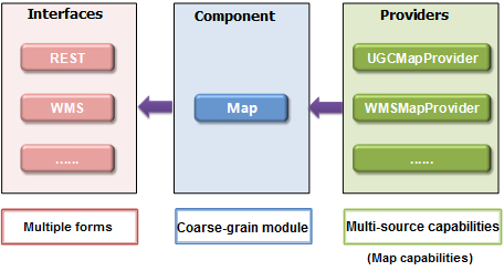 SuperMap iServer uses service components to encapsulate functions provided by service providers, and publish service components as various types of service. A service compoent can use several service providers, and can publish various types of service. Take Map service component as an example to illustrate the relations among service components service interfaces and service providers.