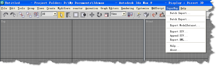 Installing the plug-in: Get the plug-in file. Extract the file and copy all the file contents into the local 3dmax9 installation directory. Start 3dmax9. The SuperMap plug-in menu can then be seen on the interface. Currently this plug-in only supports exporting 3D models (animation and non-animation) to 3D data in the SGM format of SuperMap, and exporting non-animation models to model datasets, SCV data, and KML data.