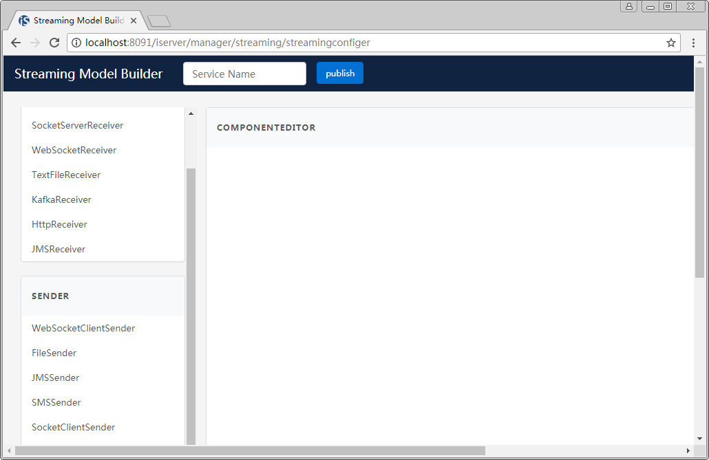 As shown in the figure, on the left is a list of components of the stream processing model, which consists of four parts: receiver, sender, mapper and filter. In the right editor, each part acts as a node, you can connect, merge the nodes and edit the attributes of each node to build the stream processing model. After finishing building, you can specify a service name on the top of the current page and then directly publish it as a streaming service by clicking the publish button.