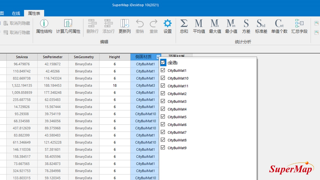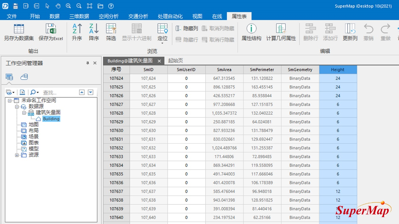 原始数据是建筑矢量面数据,属性表中需要有建筑高度或楼层数相关的属性,便于后期根据此属性拉伸成模型,示例中使用Height中的属性值。