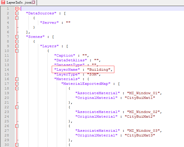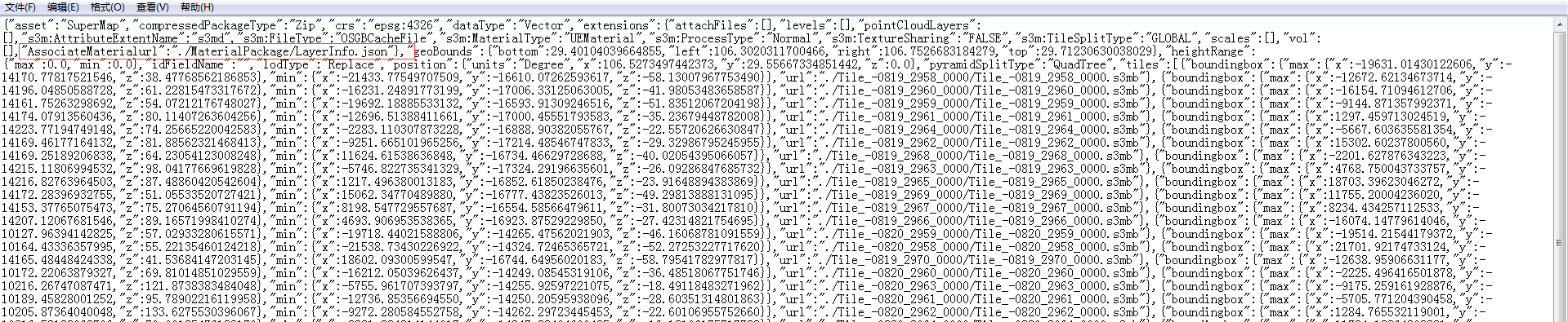 "Materials"中,默认给出了材质的关联关系,其中"AssociateMaterial"后面的材质名称为UE中的材质;"OriginalMaterial"后面的材质名称为S3M缓存数据的材质名称,是在数据处理第三步中,设置的顶面材质与侧面材质的属性值。