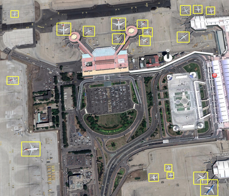 目标检测,即利用算法模型对遥感图像中的一个或多个目标的类别和位置进行自动化判定与识别。目标检测使用深度学习算法检测影像中的兴趣目标,并以矢量框的形式作为标记,确定其类别和位置。目标检测功能有着检测速度快、准确率较高等特点,通常用来快速确定影像中不同类别目标的数量和位置等空间信息。